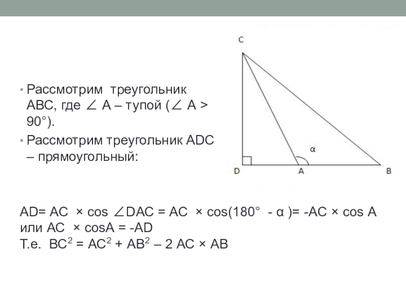 Слайд 7Рассмотрим треугольник АВС, где А – тупой ( А