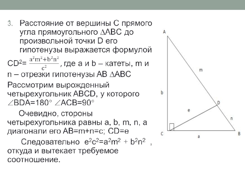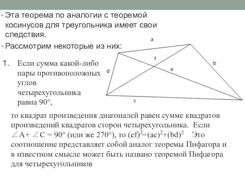 то квадрат произведения диагоналей равен сумме квадратов произведений квадратов сторон четырехугольника. Если А+ С = 90 (или же 270), то (ef)2=(ac)2+(bd)2 Это соотношение представляет собой аналог теоремы Пифагора и в известном смысле может быть названо теоремой Пифагора для четырехугольников