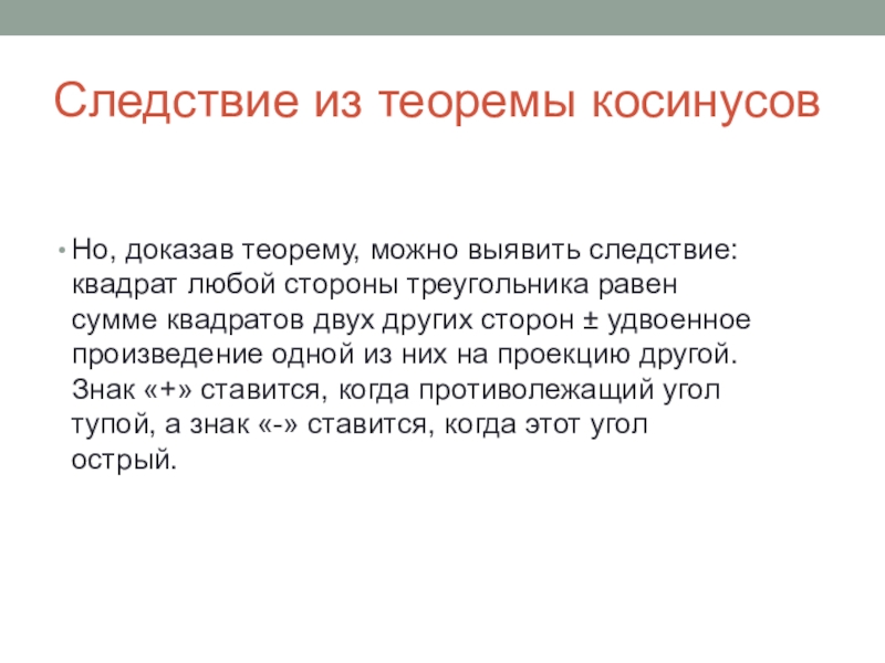 стороны треугольника равен сумме квадратов двух других сторон ± удвоенное произведение одной из них на проекцию другой. Знак «+» ставится, когда противолежащий угол тупой, а знак «-» ставится, когда этот угол острый.