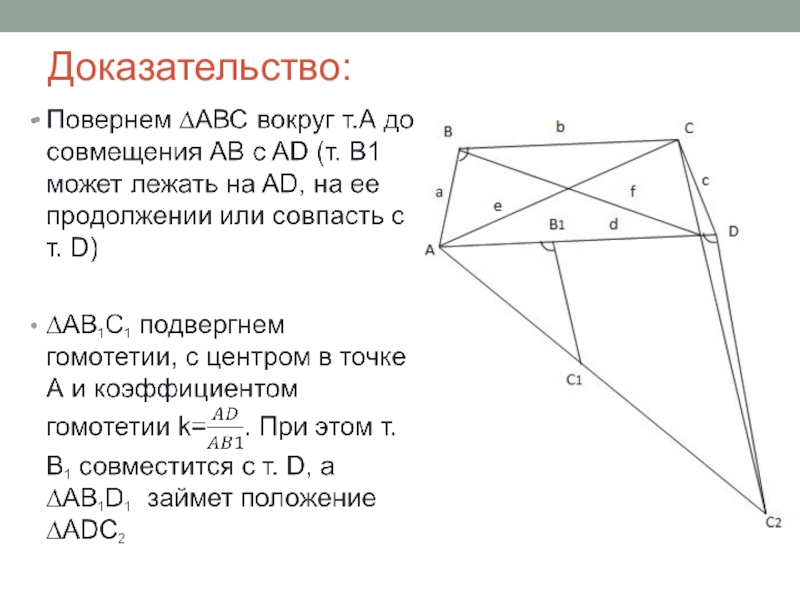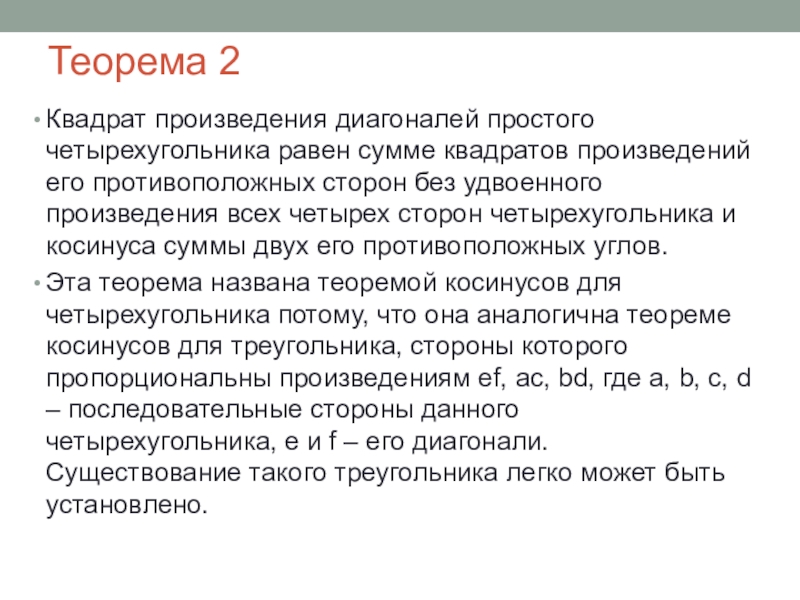 Эта теорема названа теоремой косинусов для четырехугольника потому, что она аналогична теореме косинусов для треугольника, стороны которого пропорциональны произведениям ef, aс, bd, где a, b, c, d – последовательные стороны данного четырехугольника, e и f – его диагонали. Существование такого треугольника легко может быть установлено.