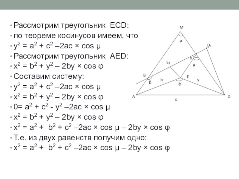 – φ)= EE1=E1C + CD1 = a × cosBCE + c × cos (180 – γ)=> y× cos φ= a × cos β + c× cos γ