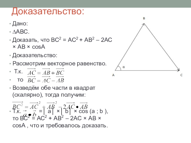Т.к. =│ a│ ×│ b│ × cos (a ; b ), то ВС2 = АС2 + АВ2 – 2АС × АВ × cosA , что и требовалось доказать.