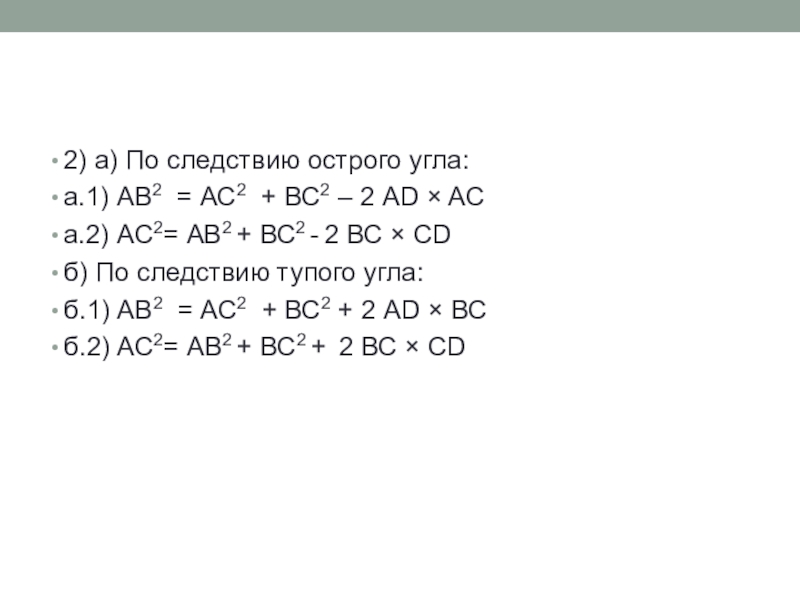 а.2) АС2= АВ2 + ВС2 - 2 ВС × СD