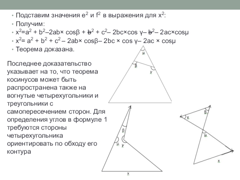 Последнее доказательство указывает на то, что теорема косинусов может быть распространена также на вогнутые четырехугольники и треугольники с самопересечением сторон. Для определения углов в формуле 1 требуются стороны четырехугольника ориентировать по обходу его контура