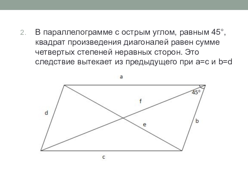 сумме четвертых степеней неравных сторон. Это следствие вытекает из предыдущего при a=c и b=d