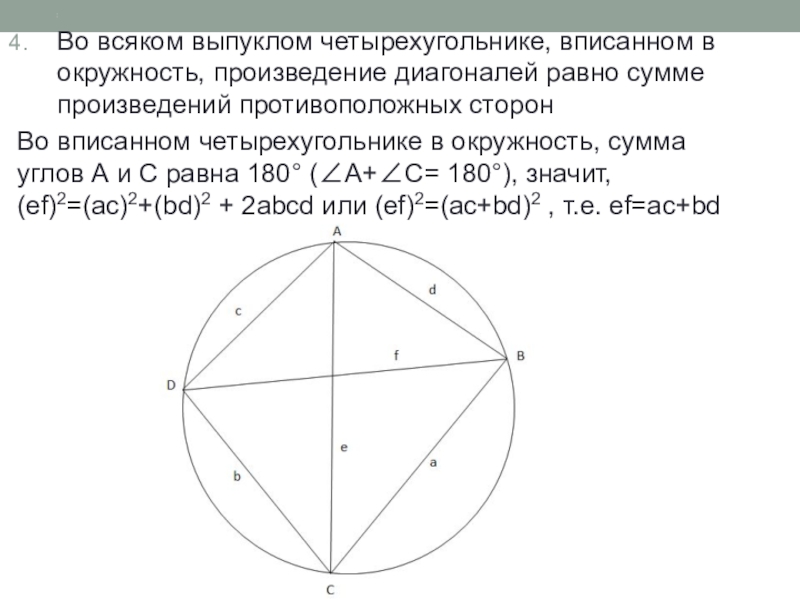 Во вписанном четырехугольнике в окружность, сумма углов А и С равна 180 (A+С= 180), значит, (ef)2=(ac)2+(bd)2 + 2abcd или (ef)2=(ac+bd)2 , т.е. ef=ac+bd