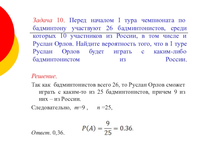 Так как бадминтонистов всего 26, то Руслан Орлов сможет играть с каким-то из 25 бадминтонистов, причем 9 из них – из России.