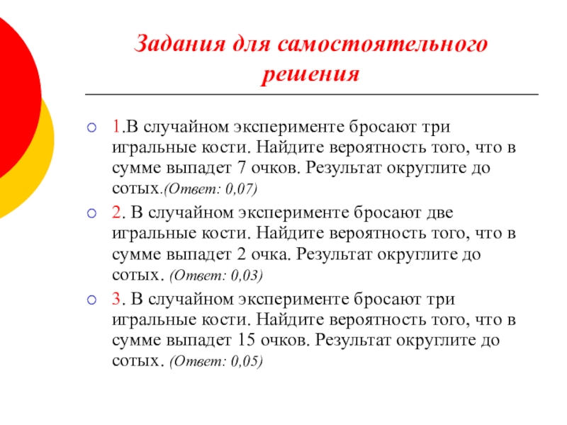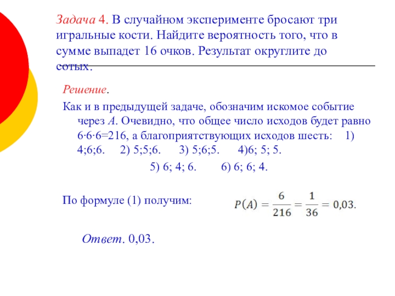 Как и в предыдущей задаче, обозначим искомое событие через А. Очевидно, что общее число исходов будет равно 6∙6∙6=216, а благоприятствующих исходов шесть: 1) 4;6;6. 2) 5;5;6. 3) 5;6;5. 4)6; 5; 5.
