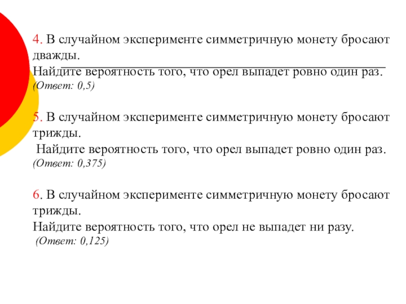 Решение. При одном подбрасывании симметричной монеты выпадет орел (событие О) или решка (событие Р). При двух подбрасываниях монеты число случаев удвоится (в предыдущих двух случаях впереди появится О или Р): ОО, ОР, РО, РР. То же происходит и при подбрасывании монеты три раза, т.е. всевозможных исходов восемь: ООО, ООР, ОРО, ОРР, РОО, РОР, РРО, РРР. Если монету подбрасывают четырежды, то число возможных исходов 16: ОООО , ОООР, ,,,, РРРР. При этом орел не выпадет ни разу только в одном случае (РРРР). Снова обозначая интересующее нас событие через А, по формуле (1) получим: