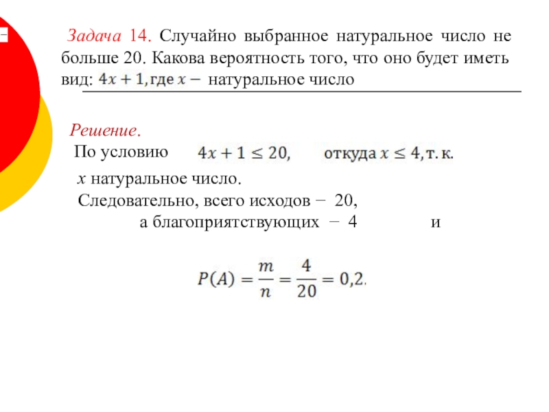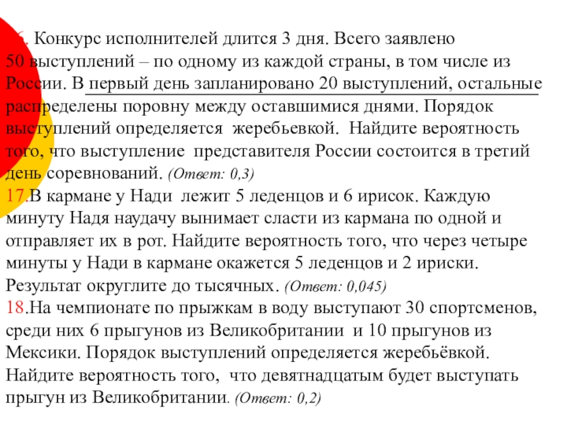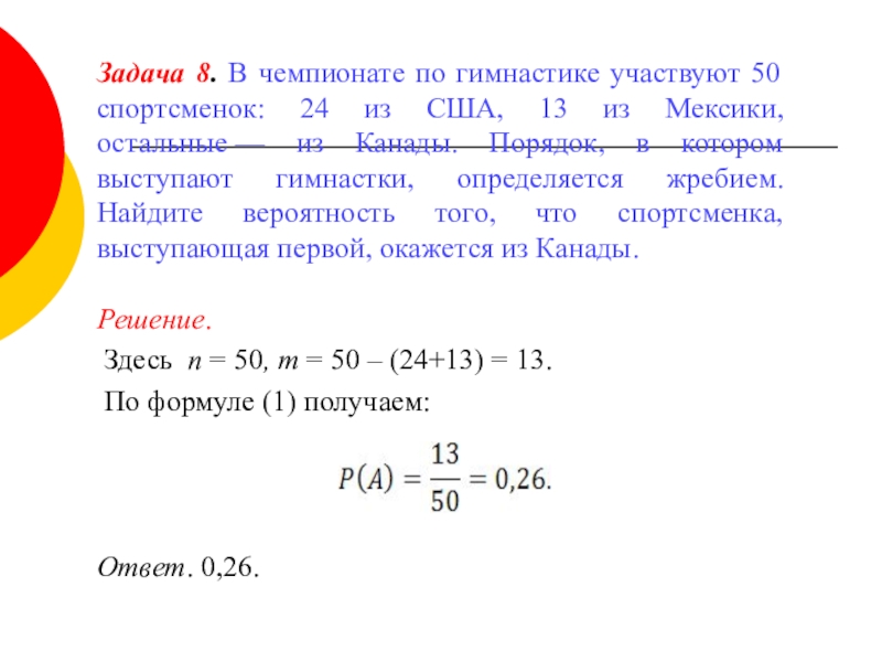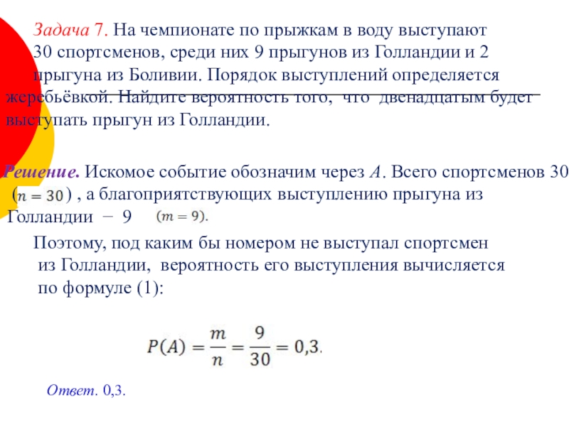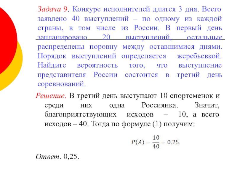 Решение. В третий день выступают 10 спортсменок и среди них одна Россиянка. Значит, благоприятствующих исходов − 10, а всего исходов – 40. Тогда по формуле (1) получим: