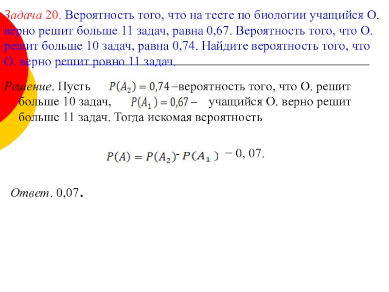 Решение. Пусть вероятность того, что О. решит больше 10 задач, учащийся О. верно решит больше 11 задач. Тогда искомая вероятность