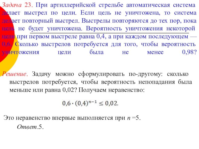 Решение. Задачу можно сформулировать по-другому: сколько выстрелов потребуется, чтобы вероятность непопадания была меньше или равна 0,02? Получаем неравенство: