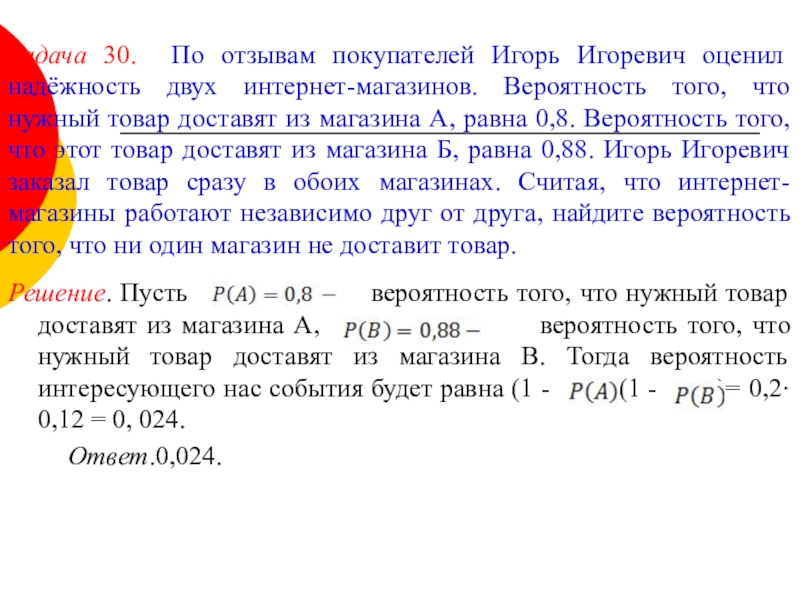 Решение. Пусть вероятность того, что нужный товар доставят из магазина А, вероятность того, что нужный товар доставят из магазина B. Тогда вероятность интересующего нас события будет равна (1 - )(1 - )= 0,2∙ 0,12 = 0, 024.