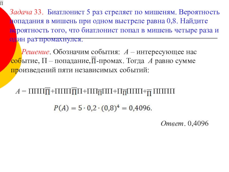 Задача 33. Биатлонист 5 раз стреляет по мишеням. Вероятность