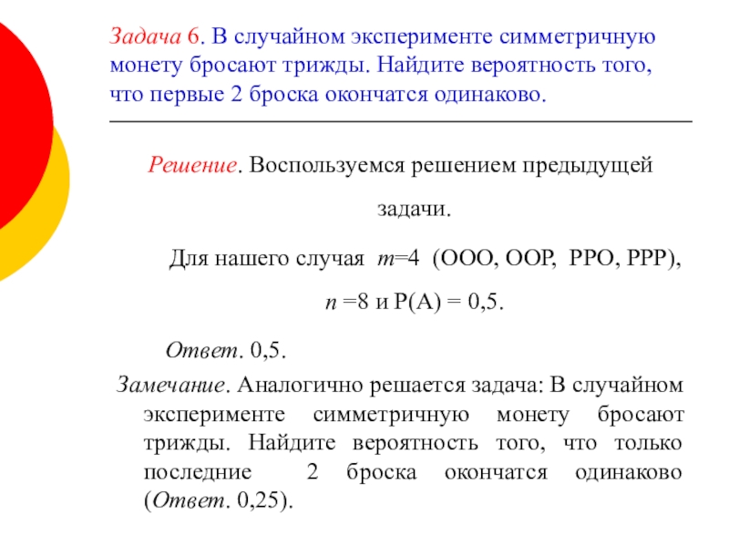Замечание. Аналогично решается задача: В случайном эксперименте симметричную монету бросают трижды. Найдите вероятность того, что только последние 2 броска окончатся одинаково (Ответ. 0,25).