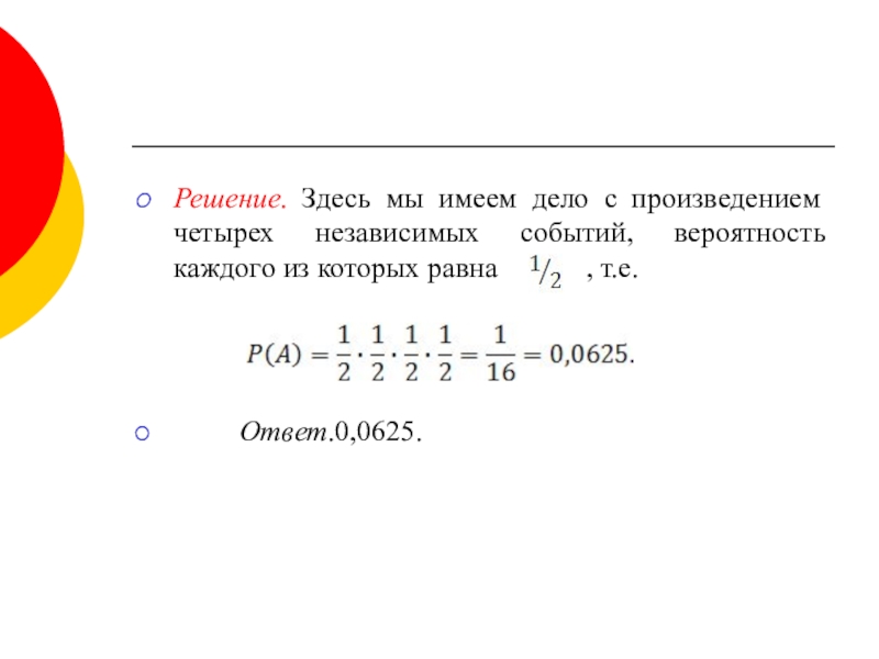 Решение. Пусть А, В, С, Д – события, означающие, что через каждую минуту Надя извлекает из кармана леденец. Нам требуется определить вероятность произведения этих событий: