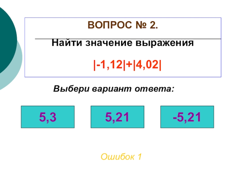 ВОПРОС № 2. Найти значение выраженияОшибок 1Выбери вариант ответа:5,35,21-5,21|-1,12|+|4,02|
