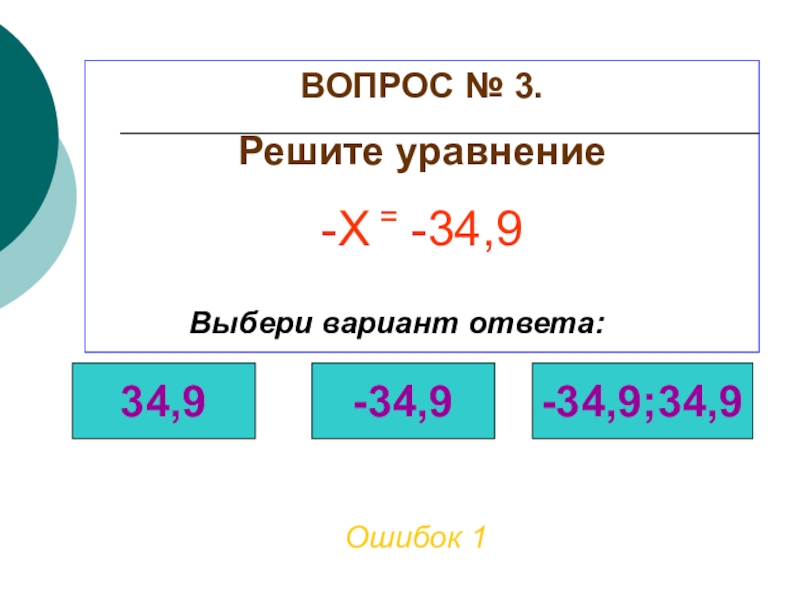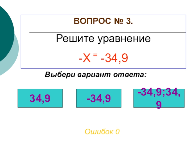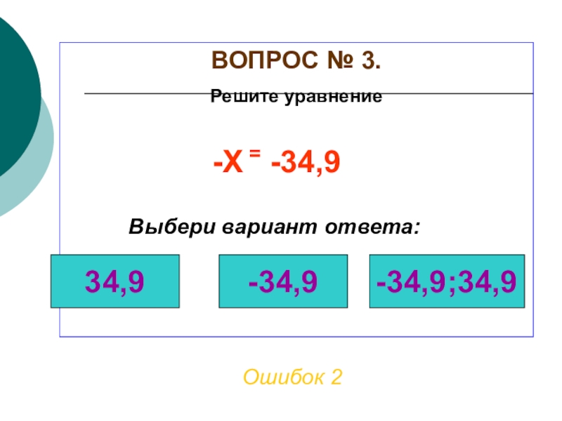 ВОПРОС № 3. Решите уравнениеОшибок 2Выбери вариант ответа:34,9-34,9-34,9;34,9-Х = -34,9