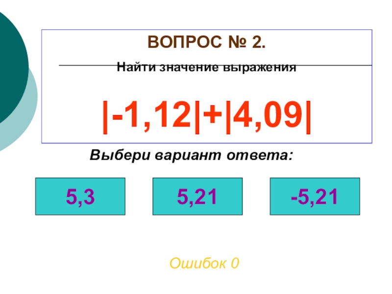 ВОПРОС № 2. Найти значение выражения|-1,12|+|4,09|Ошибок 0Выбери вариант ответа:5,35,21-5,21