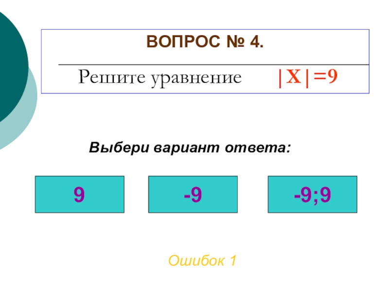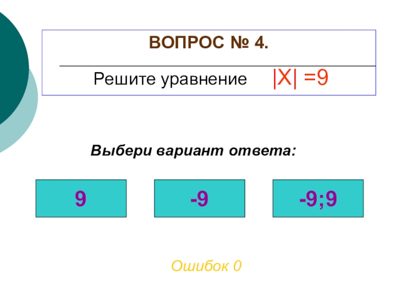 ВОПРОС № 4. Решите уравнение |X|=9Ошибок 2Выбери вариант ответа:9-9-9;9