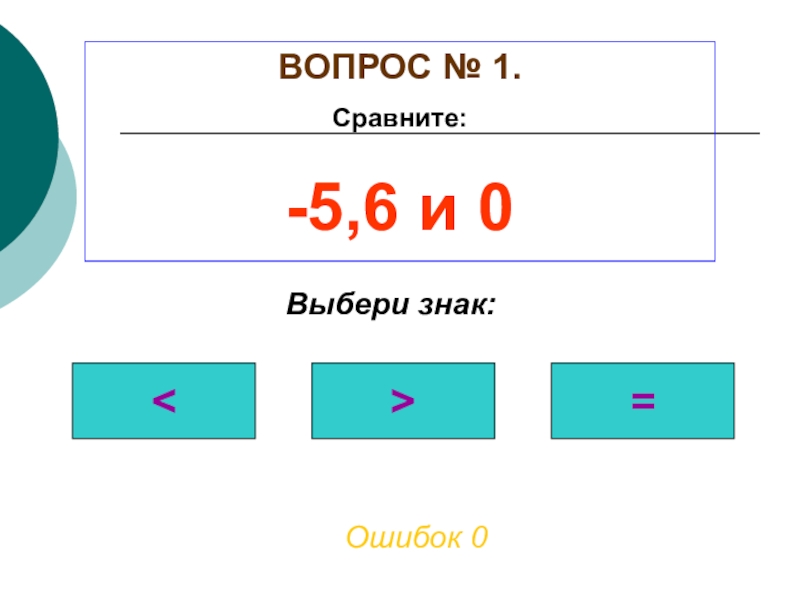 ВОПРОС № 1. Сравните: -5,6 и 0=Выбери знак:Ошибок 0