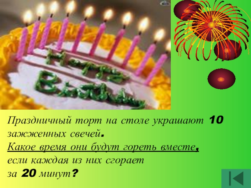 Праздничный торт на столе украшают 10 зажженных свечей.Какое время они будут гореть вместе, если каждая из них