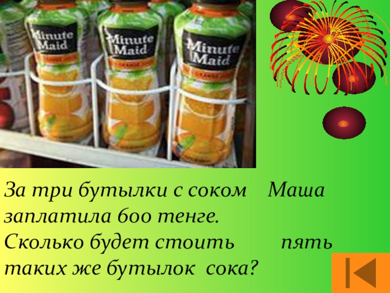 Слайд 22За три бутылки с соком Маша заплатила 600 тенге.