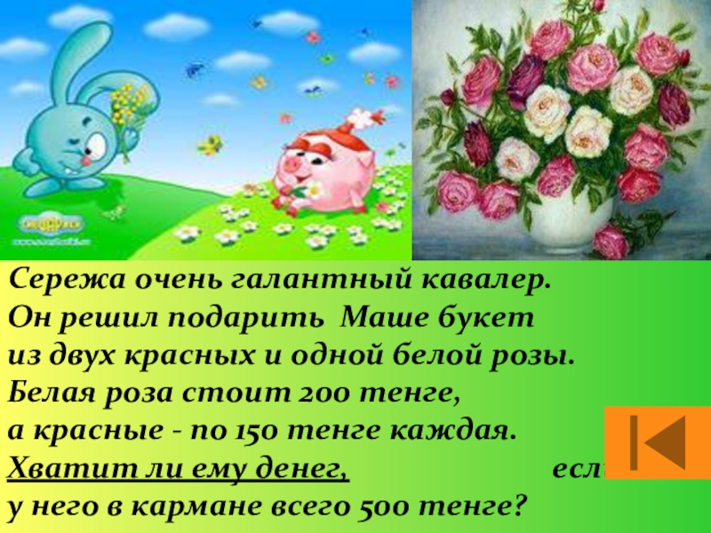 Он решил подарить Маше букет из двух красных и одной белой розы. Белая роза стоит 200 тенге, а красные - по 150 тенге каждая. Хватит ли ему денег, если у него в кармане всего 500 тенге?