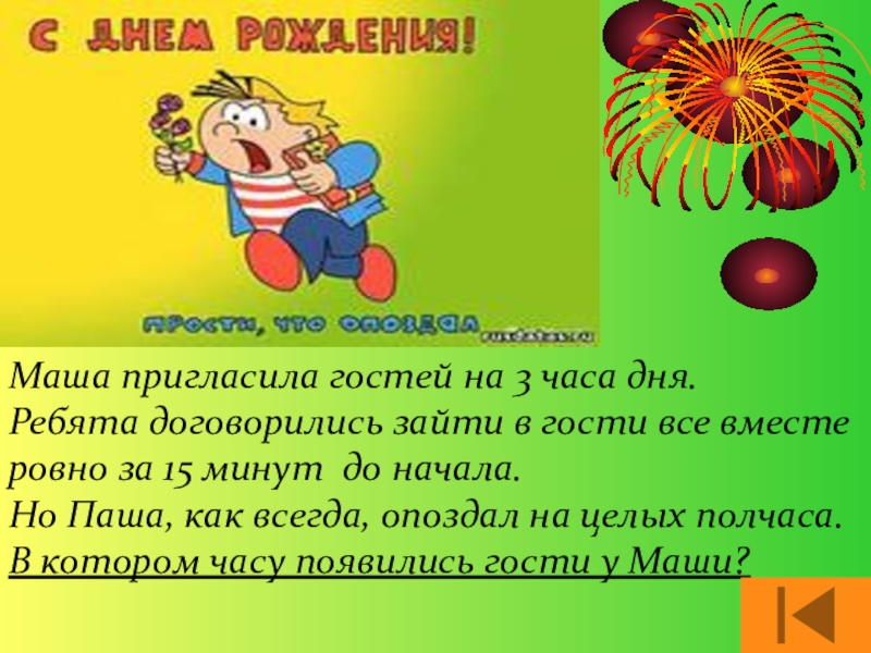 Слайд 6Маша пригласила гостей на 3 часа дня.