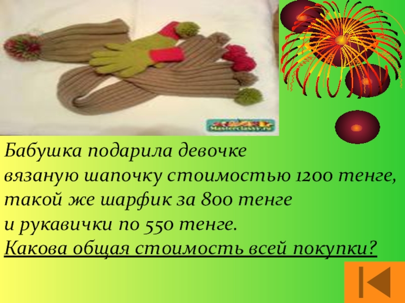 вязаную шапочку стоимостью 1200 тенге, такой же шарфик за 800 тенге и рукавички по 550 тенге. Какова общая стоимость всей покупки?