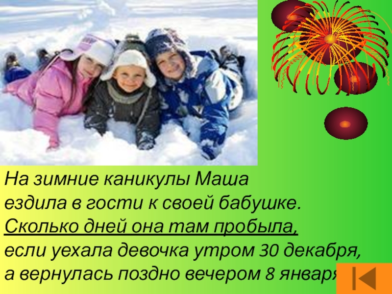 На зимние каникулы Маша ездила в гости к своей бабушке.Сколько дней она там пробыла,если уехала девочка утром