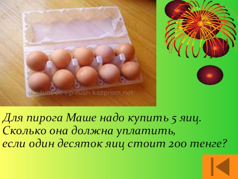 Слайд 19Для пирога Маше надо купить 5 яиц. Сколько она должна уплатить,