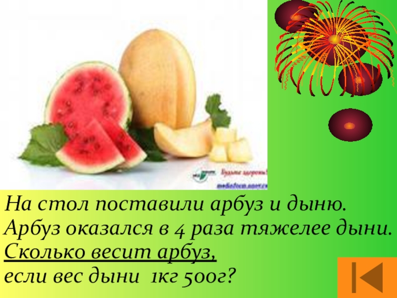 оказался в 4 раза тяжелее дыни. Сколько весит арбуз, если вес дыни 1кг 500г?