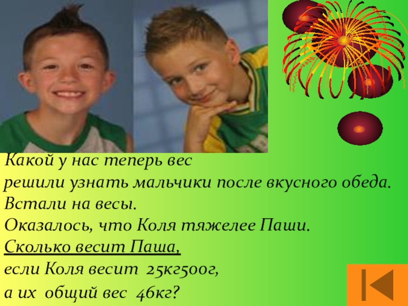 решили узнать мальчики после вкусного обеда. Встали на весы. Оказалось, что Коля тяжелее Паши. Сколько весит Паша, если Коля весит 25кг500г, а их общий вес 46кг?