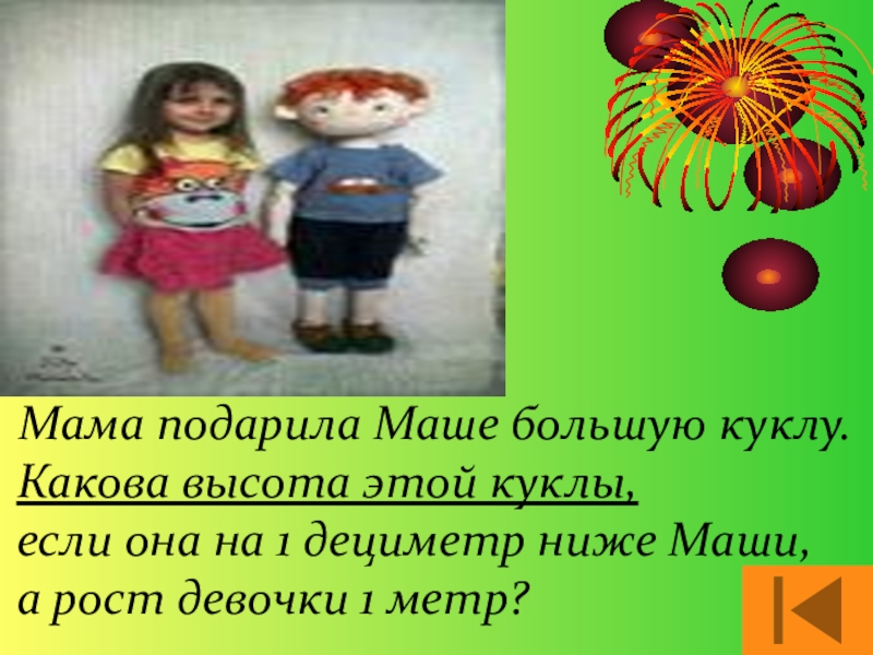 Слайд 11Мама подарила Маше большую куклу. Какова высота этой куклы,