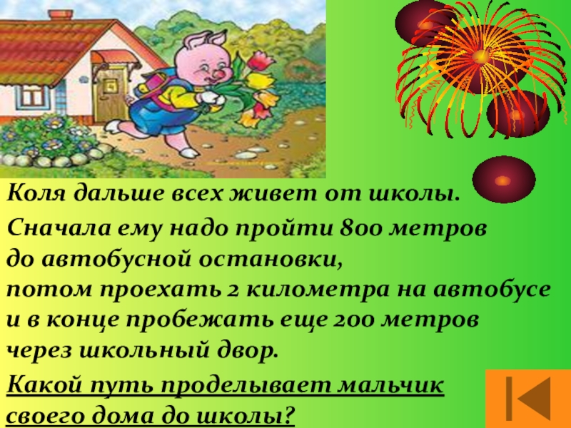 Коля дальше всех живет от школы. Сначала ему надо пройти 800 метров     до