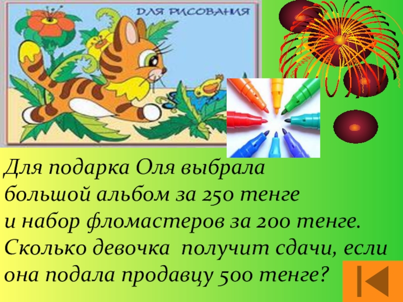 большой альбом за 250 тенге и набор фломастеров за 200 тенге. Сколько девочка получит сдачи, если она подала продавцу 500 тенге?