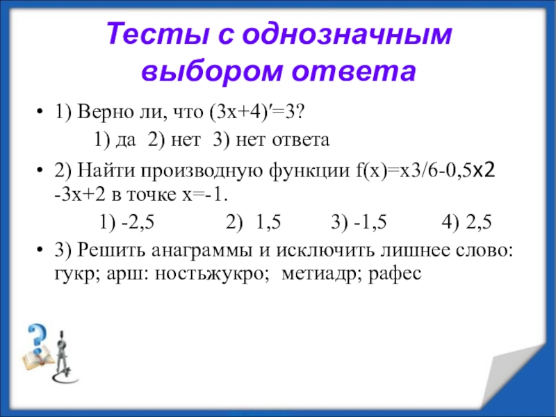 Тесты с однозначным выбором ответа 1) Верно ли, что (3x+4)′=3?      1) да