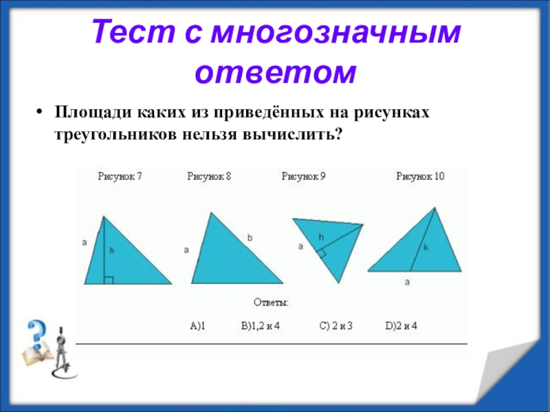Тест с многозначным ответомПлощади каких из приведённых на рисунках треугольников нельзя вычислить?