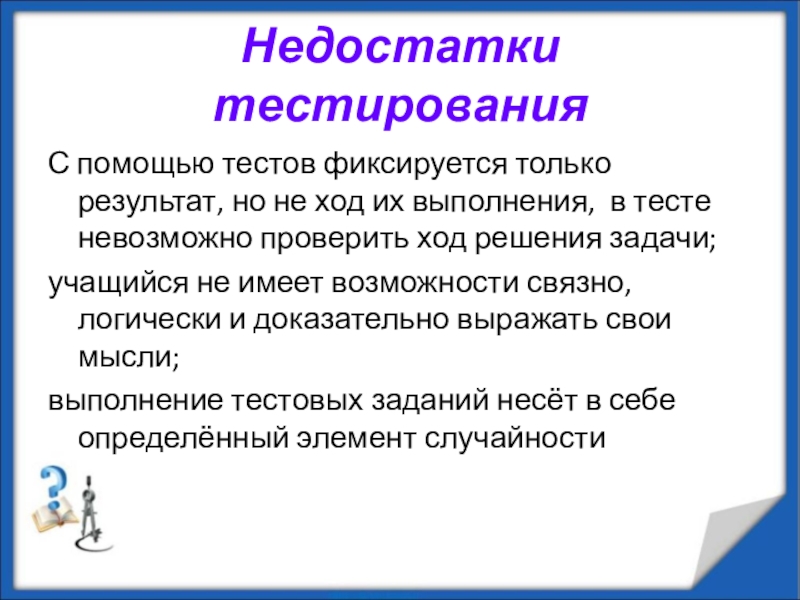 Недостатки тестированияС помощью тестов фиксируется только результат, но не ход их выполнения, в тесте невозможно проверить ход