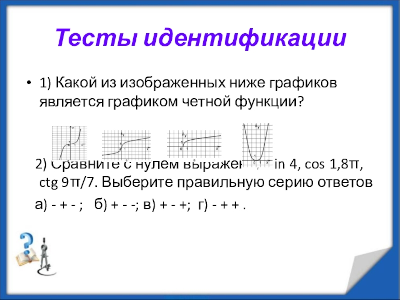 Тесты идентификации 1) Какой из изображенных ниже графиков является графиком четной функции? 		 									  2) Сравните