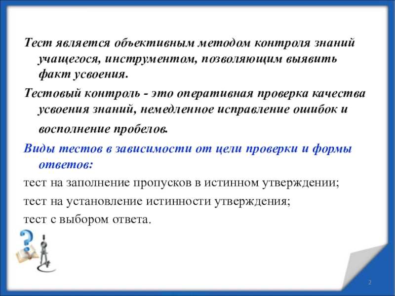 Слайд 2Тест является объективным методом контроля знаний учащегося, инструментом, позволяющим выявить факт