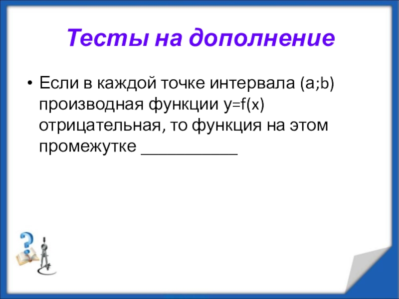 Тесты на дополнениеЕсли в каждой точке интервала (а;b) производная функции у=f(x) отрицательная, то функция на этом промежутке