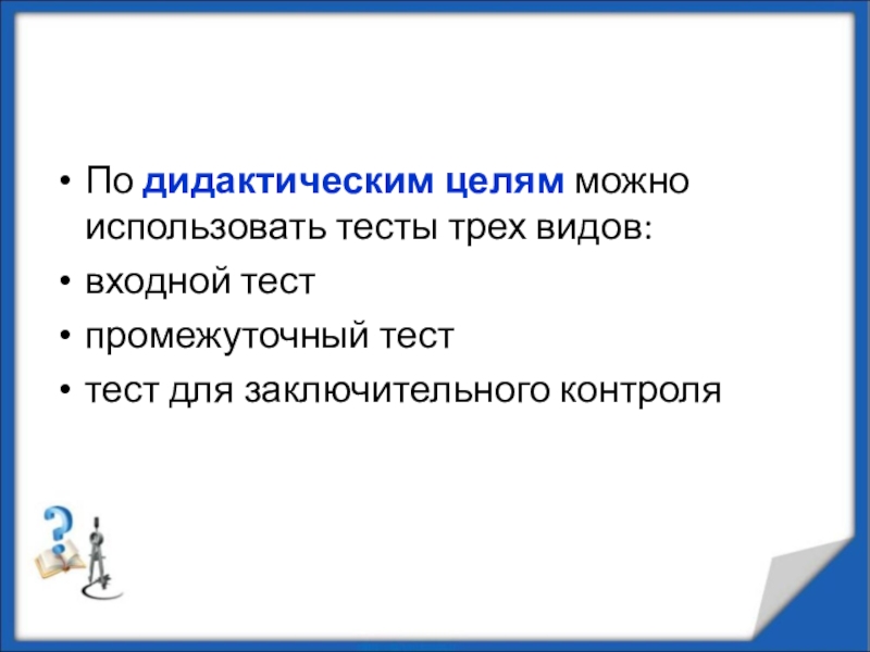 По дидактическим целям можно использовать тесты трех видов:входной тестпромежуточный тесттест для заключительного контроля