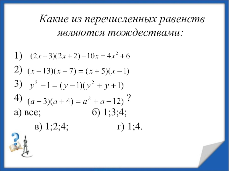 Слайд 6 Какие из перечисленных равенств являются тождествами: