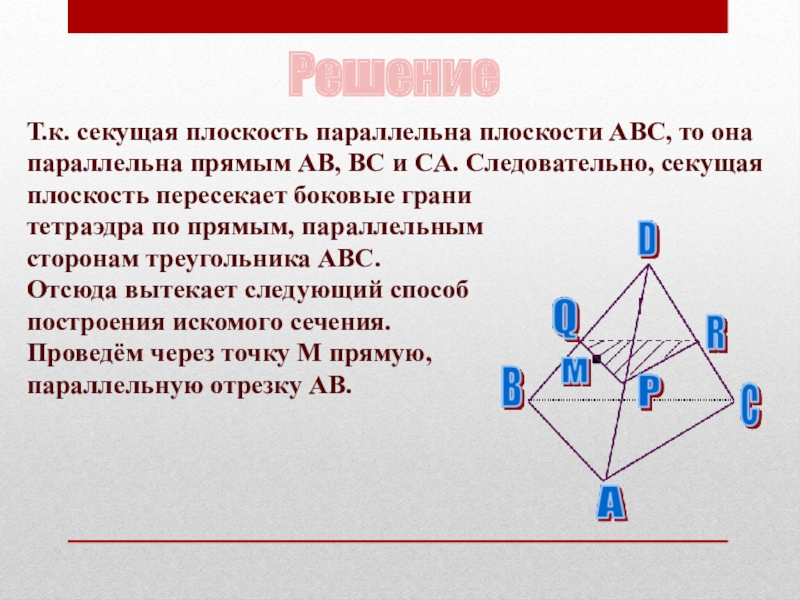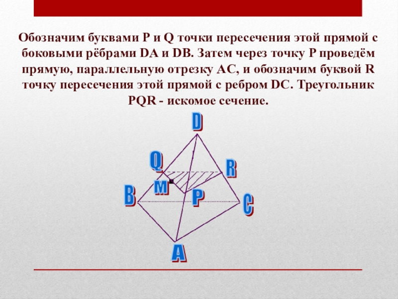 рёбрами DA и DB. Затем через точку P проведём прямую, параллельную отрезку AC, и обозначим буквой R точку пересечения этой прямой с ребром DC. Треугольник PQR - искомое сечение.