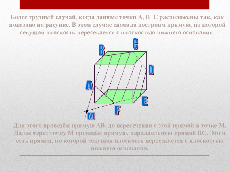 Для этого проведём прямую AB, до пересечения с этой прямой в точке M. Далее через точку M проведём прямую, параллельную прямой BC. Это и есть прямая, по которой секущая плоскость пересекается с плоскостью нижнего основания.