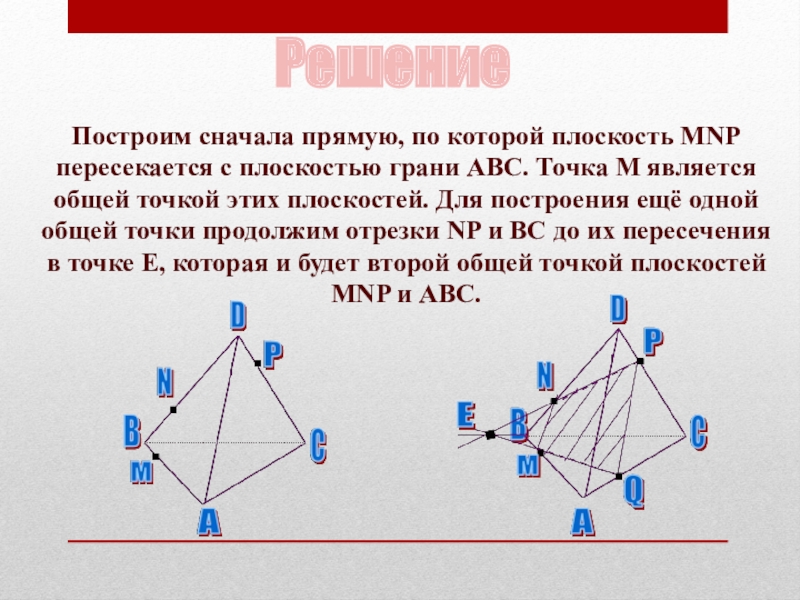ABC. Точка М является общей точкой этих плоскостей. Для построения ещё одной общей точки продолжим отрезки NP и BC до их пересечения в точке Е, которая и будет второй общей точкой плоскостей MNP и ABC.