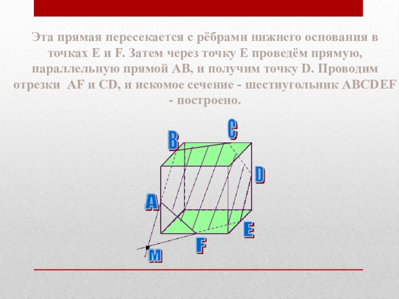 F. Затем через точку E проведём прямую, параллельную прямой AB, и получим точку D. Проводим отрезки AF и CD, и искомое сечение - шестиугольник ABCDEF - построено.
