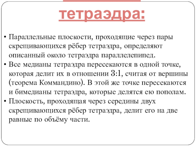 Все медианы тетраэдра пересекаются в одной точке, которая делит их в отношении 3:1, считая от вершины (теорема Коммандино). В этой же точке пересекаются и бимедианы тетраэдра, которые делятся ею пополам.